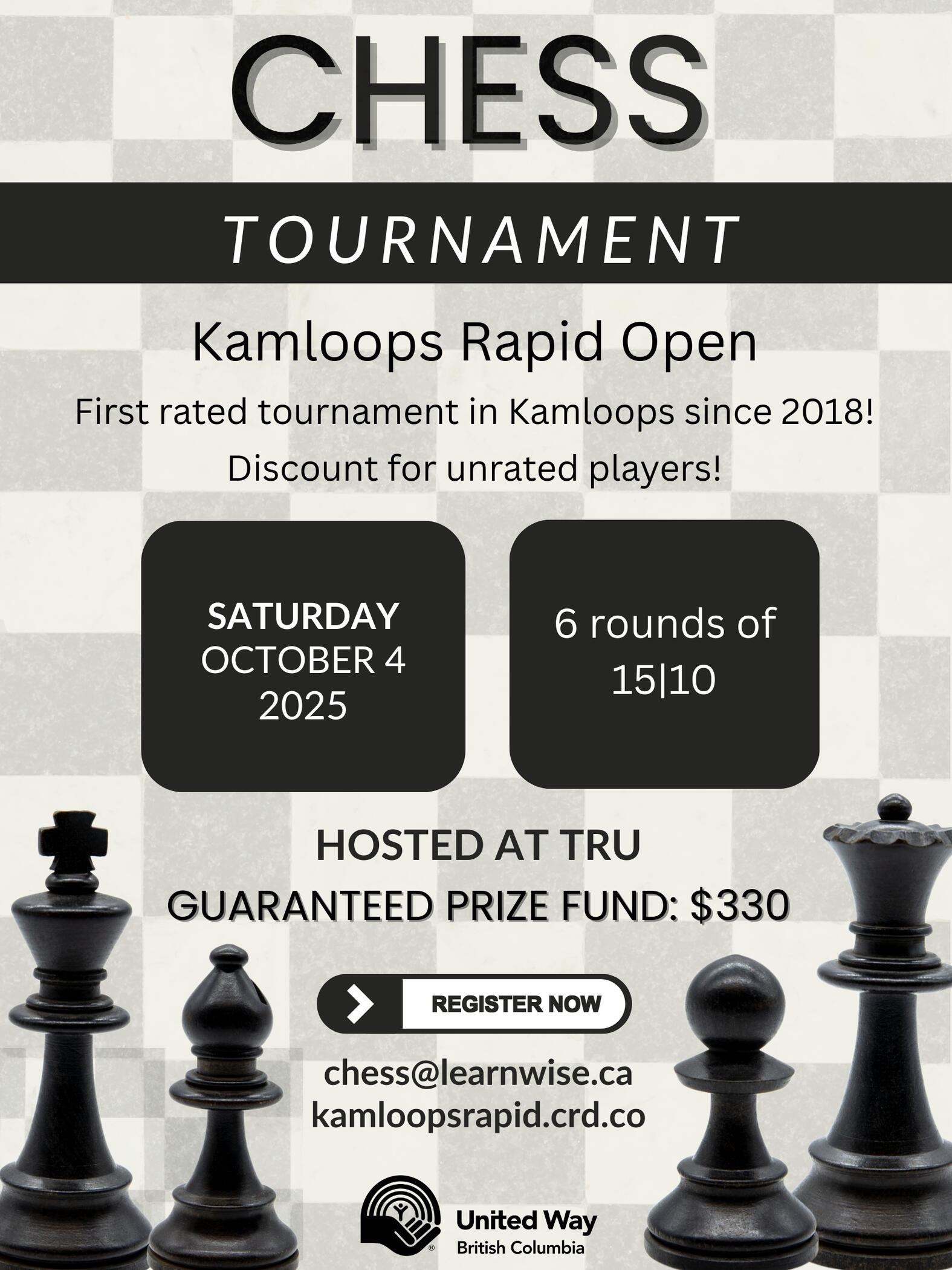Format: 6-round 15+10 Swiss in one open sectionDate: Saturday October 4, 2025Location: Thompson Rivers University, Old Main building, room 3732Default time: If late, games forfeited after 10 minutesPrizes: